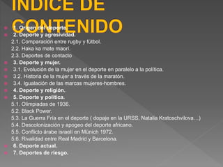 Este documento resume la historia del deporte desde sus orígenes hasta la actualidad, tocando temas como la relación entre deporte y agresividad, deporte y género, deporte y política, y deportes de riesgo. Explica cómo el deporte ha estado ligado a la caza y la guerra desde la antigüedad y cómo se han desarrollado diferentes deportes a lo largo de la historia como el rugby, el fútbol y los Juegos Olímpicos. También analiza la evolución de la participación de la mujer en el deporte y hace