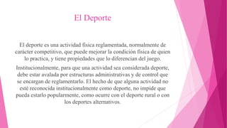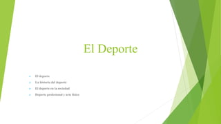 El documento trata sobre el deporte y cubre cuatro temas principales: 1) la definición e historia del deporte desde la antigüedad hasta la actualidad, 2) el impacto del deporte en la sociedad a través de la educación, economía y salud pública, 3) cómo el deporte profesional ha evolucionado debido a los medios de comunicación y tiempo libre, a veces perdiendo tradiciones, y 4) las similitudes entre el deporte y el arte en disciplinas como el patinaje artístico y el taichí.