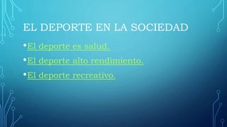 El documento explora la importancia del deporte en la sociedad, destacando sus tres principales categorías: salud, alto rendimiento y recreativo. Se enfatiza que el deporte promueve un estilo de vida saludable, mejora la calidad de vida y genera un ambiente social positivo. Además, se distingue claramente entre los deportes de alto rendimiento y recreativos, resaltando los diferentes enfoques y beneficios que ofrecen.
