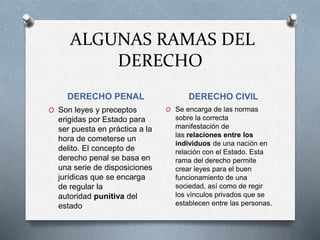 El documento define el derecho como el conjunto de normas generales dictadas por la sociedad para resolver conflictos de manera obligatoria y sancionable. Explica que el derecho es normativo, bilateral y coercitivo. Además, menciona algunas ramas principales como el derecho penal, que regula la autoridad punitiva del estado, y el derecho civil, que regula las relaciones entre individuos e individuo-estado. Por último, enumera las principales fuentes del derecho como la ley, jurisprudencia, doctrina y costumbre.