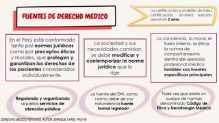 Este documento presenta información sobre el derecho médico peruano y el consentimiento informado. Brevemente describe que el derecho médico regula el ejercicio de la medicina y protege los derechos de los pacientes. Luego explica que el consentimiento informado es un derecho del paciente que requiere que se le provea información adecuada sobre cualquier procedimiento médico y se obtenga su aprobación de manera voluntaria y libre. Finalmente, resume algunas situaciones en las que se requiere y no se requiere el consentimiento informado.
