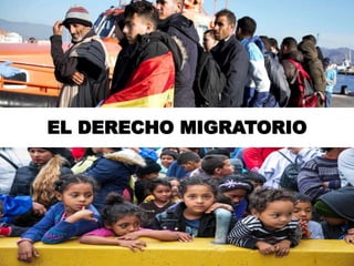 El derecho migratorio regula el tránsito internacional de personas, estableciendo normas sobre el ingreso y salida de nacionales y extranjeros. La migración, motivada principalmente por la falta de oportunidades y conflictos, ha crecido y requiere una normatividad que garantice la protección y los derechos humanos de los migrantes. La cooperación internacional es esencial para abordar este fenómeno y asegurar que los migrantes no sean explotados, así como para facilitar su contribución al desarrollo económico de los países receptores y de origen.