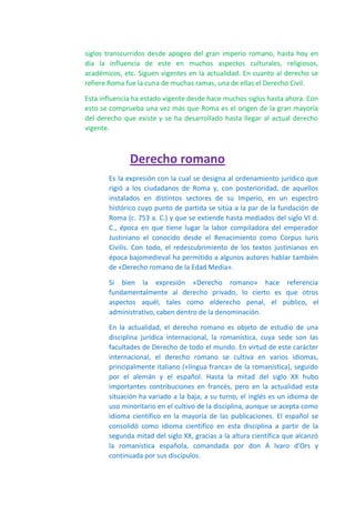 El derecho romano fue el conjunto de principios legales que rigieron la sociedad romana desde su origen hasta el emperador Justiniano. Fue fundamental para la formación jurídica moderna y fundamentó la legislación civil de Europa y América Latina. Aunque ya no es vigente, aún se invoca en los tribunales cuando hay lagunas legales. Los romanos elaboraron su derecho de manera simple y práctica.