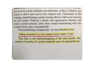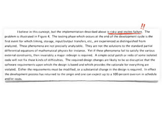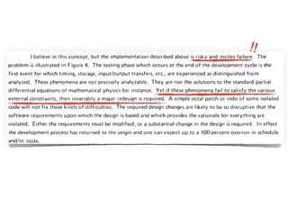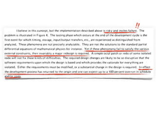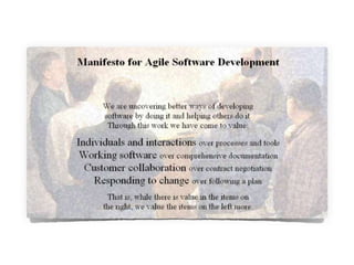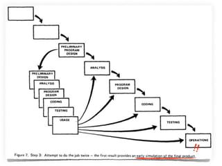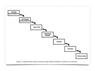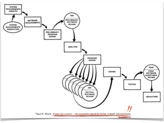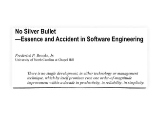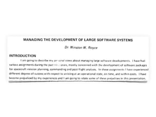Este documento presenta una discusión sobre cómo debería ser el desarrollo de software. Propone que el desarrollo de software debería ser iterativo e incremental en lugar de seguir modelos lineales como el modelo en cascada. También enfatiza la importancia de la prueba automatizada, el desarrollo guiado por pruebas y el trabajo en equipo. Finalmente, define las características de un "buen desarrollador" como alguien con pasión por su trabajo, una ética profesional sólida y la voluntad de generar cambios positivos a través