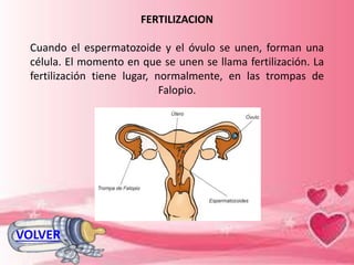 El documento describe las etapas clave del desarrollo prenatal y posnatal de un bebé. Comienza con la fertilización del óvulo por el espermatozoide, formando un zigoto que se convierte en embrión. El feto se desarrolla en el útero, obteniendo alimento y oxígeno de la placenta. El nacimiento ocurre a los nueve meses, pero los bebés prematuros nacen antes de tiempo y requieren atención especial. Un recién nacido es alimentado, ya sea con leche materna o de bib
