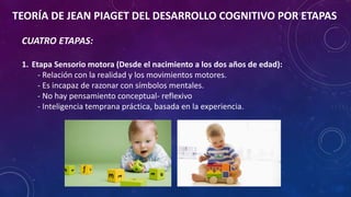 El documento resume las principales teorías del desarrollo cognitivo y moral en niños propuestas por Piaget, Erikson, Kohlberg y otros. Según Piaget, el desarrollo cognitivo ocurre en cuatro etapas clave desde el nacimiento hasta la adolescencia. Erikson describe las etapas por las que pasan los niños en su desarrollo emocional y social. Kohlberg propone que el razonamiento moral evoluciona a través de diferentes estadios, desde consideraciones puramente egoístas hasta una comprensión más amplia de las norm