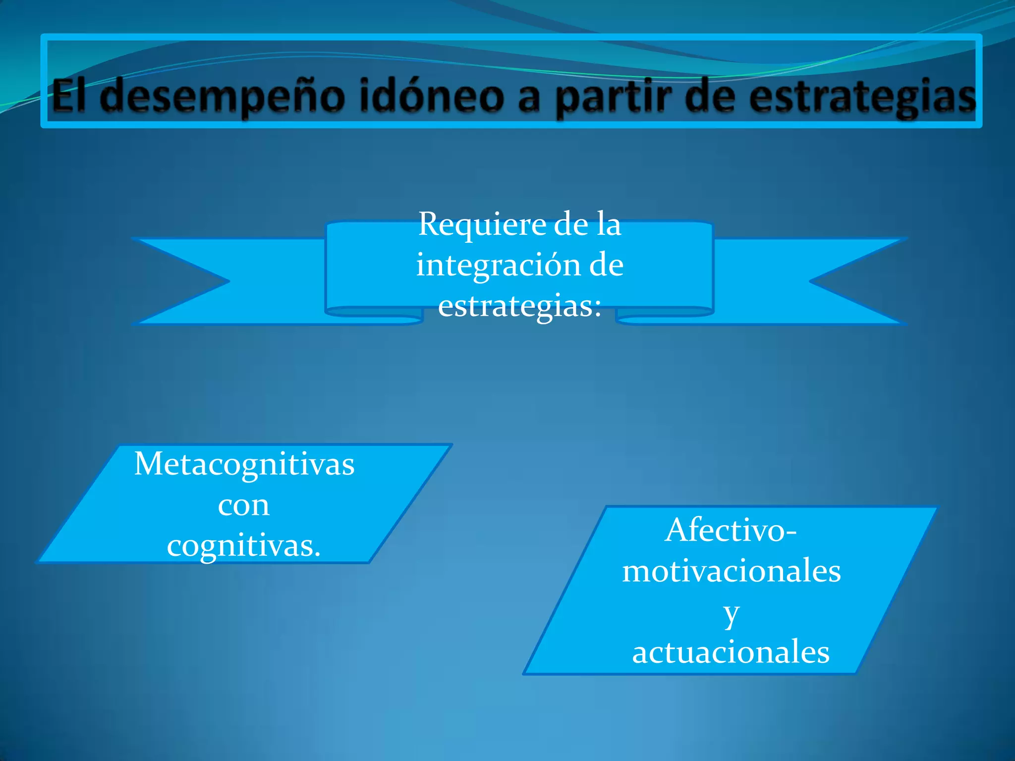 Este documento describe cómo la integración de estrategias metacognitivas, cognitivas, afectivo-motivacionales y actuacionales son requeridas para abordar una actividad o problema. Estas estrategias involucran la planeación, monitoreo, autorregulación y evaluación del desempeño de una persona ante una tarea, así como la adquisición, transferencia, recuperación y personalización del conocimiento y procesos involucrados.