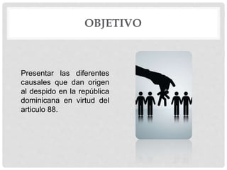 Este documento resume las causales del despido en la República Dominicana de acuerdo al artículo 88. Explica que el despido es la resolución unilateral del contrato de trabajo por parte del empleador y puede ser justificado o injustificado. Enumera las causas que permiten al empleador dar por terminado el contrato como cuestiones de hecho, relaciones de trabajo, conducta del trabajador y razones relacionadas con la empresa o persona del trabajador. Finalmente, menciona algunas causales específicas como actos deshonestos, error del empleador