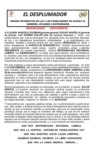 Los trabajadores de Avícola El Madroño denuncian a la gerencia por atropellar los derechos laborales de los trabajadores sindicalizados y no sindicalizados a través de chantajes y opresión. Hace cuatro meses, el presidente del sindicato SINTRAIMAGRA fue amenazado por un contratista de la empresa, pero la gerencia no ha tomado medidas para proteger a los trabajadores. Los trabajadores piden seguir denunciando a la gerencia "antiobrera y genocida" y luchar por la estabilidad, el bienestar
