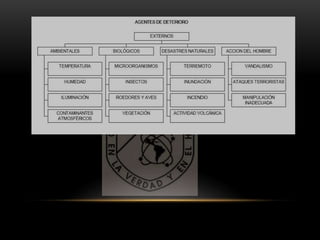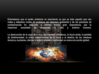 Este documento discute los problemas del deterioro ambiental como la destrucción de la capa de ozono, el cambio climático y la pérdida de biodiversidad. Explica cómo la actividad humana está afectando negativamente el medio ambiente a través del uso de sustancias como los clorofluorocarbonos. Finalmente, propone soluciones como el uso de energías renovables, fertilizantes orgánicos y reforestación para evitar más daños ambientales.
