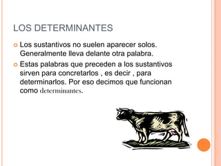 Los determinantes son palabras que preceden a los sustantivos para concretarlos u "determinarlos". El artículo es un tipo de determinante que no tiene significado propio y se utiliza para anunciar la presencia de un sustantivo. Existen dos formas principales de artículo en español - el/la para singular y los/las para plural - así como formas contractas como "al" y "del".