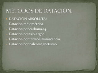 El documento describe el período Devónico, que ocurrió hace entre 416-359 millones de años. Fue un período cálido que vio la primera expansión de vida terrestre incluyendo plantas, artrópodos e insectos. En los mares hubo una diversificación de peces y vida marina. Sin embargo, al final del período ocurrió una extinción masiva que afectó gravemente la vida marina.