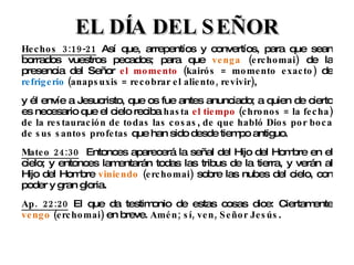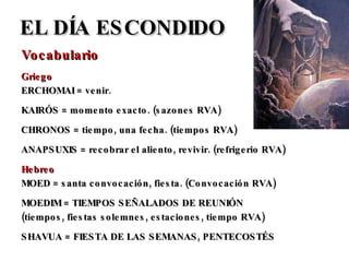 Este documento resume varios pasajes bíblicos relacionados con la venida del Señor y la parábola de la higuera. Explica que la generación que vio la creación del Estado de Israel en 1947 presenciará la segunda venida de Cristo antes de 2010. También analiza las fiestas hebreas, especialmente la fiesta de las trompetas, como posibles indicadores del momento exacto de su regreso.