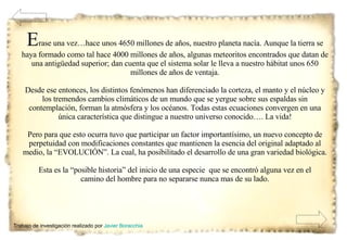El documento resume la evolución de los mamíferos desde los primeros reptiles mamiferoides como el Cynodonte hace 220 millones de años hasta la aparición del perro y su vínculo con el hombre. Describe hitos como la extinción de los dinosaurios hace 65 millones de años que permitió a los mamíferos dominar, y la similitud genética del 25% entre humanos y perros que sugiere un ancestro común.