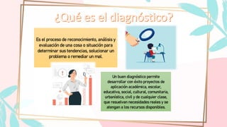 El documento habla sobre los diferentes tipos de diagnósticos. Explica que un diagnóstico es el proceso de reconocer y evaluar una situación para determinar sus tendencias y solucionar problemas. Luego menciona algunos tipos específicos como diagnósticos médicos, psicológicos, sociales y por imágenes. También describe brevemente los pasos de un diagnóstico y explica que un diagnóstico comunitario busca identificar las necesidades y problemas de una comunidad a través de la participación ciudadana para encontrar soluciones.