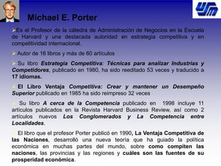 El documento resume la teoría del Diamante de la Competitividad de Michael Porter. Porter propuso que cuatro atributos interactúan para determinar la ventaja competitiva de una nación: factores de producción, condiciones de demanda, industrias relacionadas e instituciones de apoyo. El diamante de Porter ayuda a explicar por qué algunas naciones son más competitivas que otras en ciertas industrias.