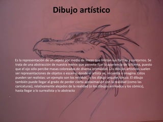 El dibujo es una forma de expresión artística que implica plasmar imágenes sobre una superficie plana utilizando líneas y sombras. Se considera el lenguaje gráfico universal para transmitir ideas y cultura. El dibujo artístico implica representar objetos o escenas de forma realista o estilizada a través de líneas que delimitan formas y contornos. Los instrumentos tradicionales para dibujar son lápices y papel, pero también se pueden usar computadoras, tabletas digitales y otros dispositivos.