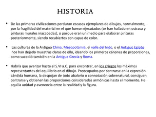 El documento resume la historia del dibujo desde las primeras civilizaciones hasta el Renacimiento. Explica que en la Antigua Grecia se establecieron los primeros cánones de proporción y que en el Renacimiento el dibujo alcanzó cotas sublimes al estudiar la representación de la realidad con fidelidad y perspectiva. También clasifica los diferentes tipos de dibujo como artístico, geométrico, geodésico y técnico; e identifica los instrumentos y materiales más usados como el lápiz y papel o table