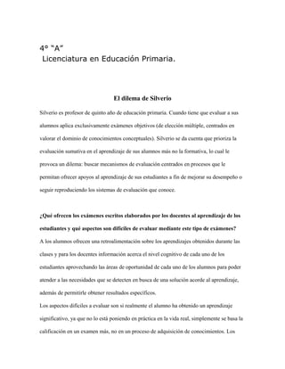 Silverio, un maestro de quinto grado, se da cuenta que se enfoca demasiado en la evaluación sumativa y no formativa. Usa exclusivamente exámenes de opción múltiple para calificar a sus estudiantes. Esto le causa un dilema sobre si debe buscar nuevas formas de evaluar el proceso de aprendizaje de los estudiantes. El documento discute diferentes tipos de evaluación y cómo Silverio podría complementar sus exámenes con evaluaciones formativas y diagnósticas para obtener una visión más completa del progreso de los estudiantes