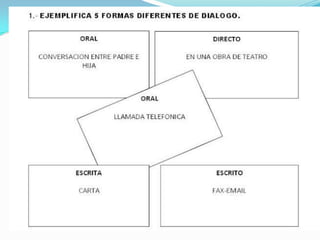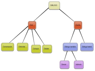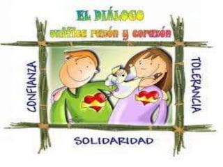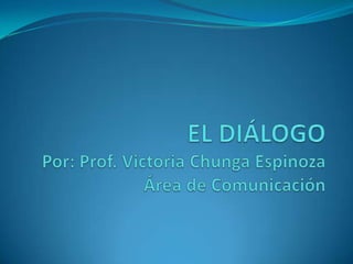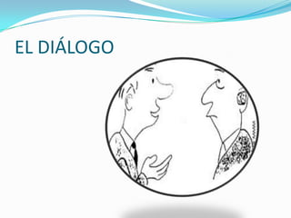 El diálogo es una conversación entre dos o más personas donde intercambian información, pensamientos, sentimientos y deseos. Existen diálogos espontáneos y planificados. Para tener un buen diálogo se requiere respeto, dejar hablar a los demás, y usar un tono de voz adecuado.