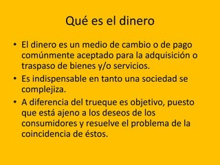 El documento describe las características del dinero, incluyendo que es un medio de cambio comúnmente aceptado para la adquisición de bienes y servicios, que otorga liquidez y es indispensable para sociedades complejas. Explica que existen diferentes tipos de dinero como el dinero-mercancía, dinero fiduciario, dinero bancario y dinero legal en forma de billetes y monedas. También señala las cualidades del dinero como ser duradero, transportable y de reconocimiento universal.