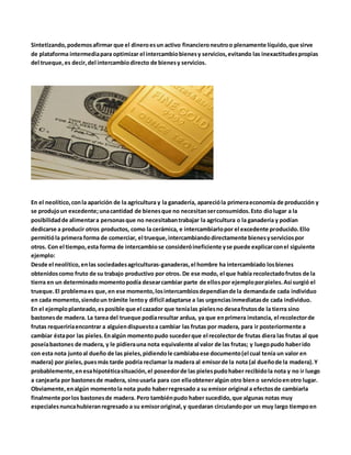 El documento resume las funciones y evolución del dinero. Explica que el dinero sirve como medio de intercambio, unidad contable y depósito de valor. Comenzó como trueque pero evolucionó a bienes como conchas, metales y monedas para facilitar las transacciones. Actualmente los billetes y monedas son emitidos por los gobiernos y respaldados por bancos centrales.