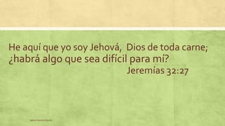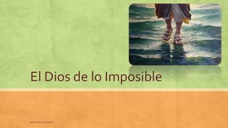 El documento describe a Dios como el Dios de lo Imposible que puede hacer cualquier cosa. Citas varios pasajes bíblicos que describen momentos en que Dios actuó de manera poderosa para dividir el Mar Rojo, derrotar a los enemigos de Israel y sanar a Pablo después de ser mordido por una víbora. El documento concluye preguntando qué debemos hacer nosotros y sugiere que debemos creer en Dios y en Jesús para poder hacer lo imposible.