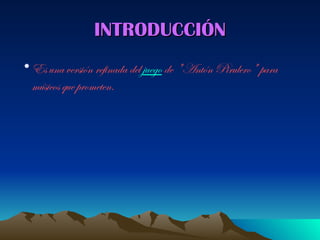Este documento presenta las reglas para un juego llamado "Natalia y Nuria" donde los jugadores imitan los gestos de un director de orquesta invisible para descubrir su identidad. Los jugadores se sientan en círculo y eligen secretamente al director, quien hace gestos como si tocara instrumentos diferentes al ritmo de una canción. Los demás imitan sus gestos sin revelar al director. Un jugador es enviado fuera del círculo y debe identificar al director cuando regrese. Si lo logra, cambian de roles.