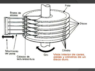 Un disco duro es un componente de hardware que se usa para almacenar de forma permanente la información y datos de un ordenador. Contiene varios discos magnéticos giratorios con cabezales que leen y escriben la información de forma similar a un tocadiscos. Su tamaño limita la cantidad de datos que puede almacenar.