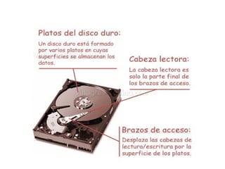 El documento describe los discos duros, incluyendo cómo funcionan al almacenar y leer datos, las empresas que los fabrican y los avances históricos. Explica también los estándares ATA, SATA y SCSI que definen las velocidades de transferencia de datos de los discos duros.