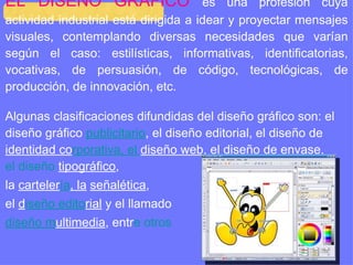 El documento describe los diferentes tipos de diseño gráfico y los recursos que utiliza, incluyendo diseño editorial, de identidad corporativa, envases, etiquetas, señalética, carteles, material didáctico y más. Explica que el diseño gráfico es interdisciplinario y requiere conocimientos de fotografía, dibujo, geometría, psicología y más. También clasifica los productos de diseño gráfico y describe elementos clave del diseño editorial y de revistas/periódicos como la tipografía y la retícula