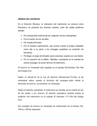 Este documento resume el origen y regulación del divorcio en el derecho romano y venezolano. En el derecho romano, el divorcio (divortium) podía producirse por incapacidad matrimonial, muerte de un cónyuge, condena a prisión u otras razones. En Venezuela, el divorcio está regulado en el Código Civil y puede darse por adulterio, abandono, maltrato, separación por más de 5 años u otras causales. El documento también explica los procedimientos de divorcio como la separación de cuerpos y bienes y el divorcio