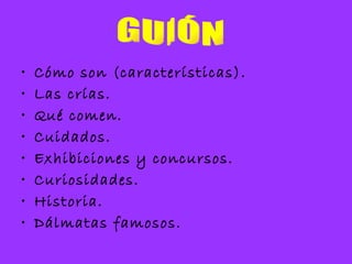 El documento describe las características y cuidados del perro dálmata, incluyendo que tienen pelaje blanco con manchas negras o marrones, nacen sin manchas y muchos sordos, comen pienso especial y no restos humanos, y requieren jugar, cepillarles diariamente y darles buena alimentación. También cubre la historia de la raza, exhibiciones y los dálmatas más famosos de la película 101 dálmatas.