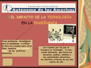 El documento discute el impacto de la tecnología en la enseñanza y cómo ha cambiado el rol del docente de presencial a virtual. Mientras que algunos docentes usan la tecnología para facilitar tareas y la comprensión, otros argumentan que podría empobrecer las condiciones de enseñanza. Además, aunque los videos pueden usarse para desarrollar temas, a menudo su duración causa dificultades, y es importante no ignorar los mensajes de los medios para permitir un desarrollo genuino del pensamiento cr