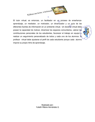La educación virtual permite que los estudiantes no asistan físicamente a clases, sino que reciban materiales de estudio electrónicos. Los educadores pueden crear comunidades de aprendizaje en línea. Algunos estudiantes pueden asistir a tutoriales o exámenes en persona. La educación virtual ofrece procesos educativos extensos y complejos a través de recursos multimedia, manteniendo contacto continuo con los estudiantes. El tutor virtual facilita un proceso de enseñanza-aprendizaje mediante la motivación, dinamización y