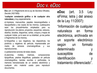 El documento analiza la regulación y características de los documentos electrónicos (edocs) en las administraciones públicas, destacando su validez legal y condiciones de archivo y conservación. Se detallan formatos, virtudes y defectos de los edocs, así como la normativa aplicable y los procedimientos para la autenticidad y conservación de copias. Se enfatiza la importancia de la estandarización y la interoperabilidad en la gestión de documentos electrónicos entre instituciones.