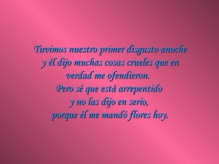 El documento describe una relación de abuso doméstico en la que la víctima recibe flores de su agresor después de cada episodio de violencia, lo que la lleva a creer erróneamente que él está arrepentido. Sin embargo, la violencia continúa escalando, poniendo en peligro su vida. El documento enfatiza la necesidad de buscar ayuda profesional para las víctimas de violencia doméstica antes de que sea demasiado tarde.