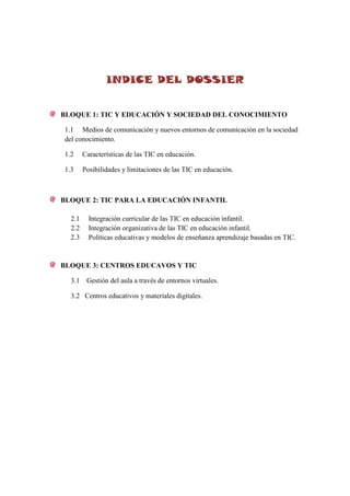Este documento presenta un dossier sobre el uso de las TIC en educación infantil. Se divide en tres bloques principales. El primer bloque cubre las TIC y la sociedad del conocimiento, incluyendo las características y posibilidades y limitaciones de las TIC en educación. El segundo bloque se centra en la integración de las TIC específicamente en educación infantil. El tercer bloque analiza la gestión de aulas y centros educativos a través del uso de las TIC y materiales digitales.