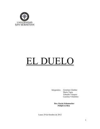 Este documento resume las 5 etapas del duelo descritas por Elizabeth Kübler-Ross: negación, ira, negociación, depresión y aceptación. También describe el duelo patológico y cómo varía la respuesta al duelo según las diferentes edades, desde bebés hasta adolescentes. Finalmente, incluye una breve reseña biográfica de Elizabeth Kübler-Ross y cómo sus experiencias la llevaron a dedicar su vida al estudio de la muerte y el duelo.