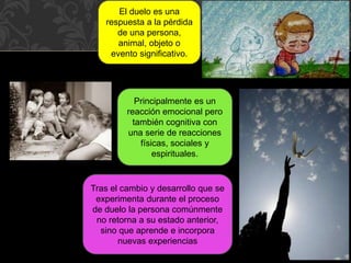 Este documento presenta información sobre el proceso de duelo. Explica que el duelo es una respuesta natural y adaptativa ante la pérdida de un ser querido e involucra reacciones emocionales, cognitivas y físicas. Describe las etapas típicas del duelo como la negación, la ira y la depresión, y cómo con el tiempo la persona se reorganiza y se recupera. También analiza las manifestaciones del duelo y los factores que pueden influir en el proceso como la cultura o el tipo de pé