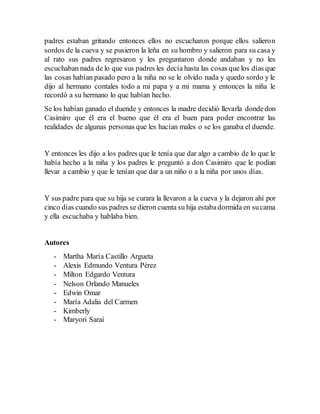 Una familia envió a sus hijos Juan y María a recoger frutas, flores y leña. Los niños encontraron una cueva mágica donde quedaron atrapados por un duende. Sus padres los buscaron y solo encontraron sus suéteres. El duende dejó ir a los niños pero quedaron sordos. Su madre los llevó con un curandero quien dijo que para curarlos debían dejar a uno de los niños en la cueva durante cinco días. Después de eso, la niña podía oír y hablar de nuevo.