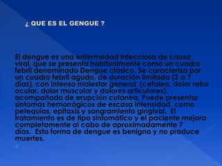 El documento describe el dengue, una enfermedad viral transmitida por mosquitos que puede presentarse de forma clásica o hemorrágica. La forma clásica se caracteriza por fiebre y erupción cutánea, mientras que la hemorrágica incluye manifestaciones hemorrágicas graves y puede ser mortal. El dengue se transmite a través de la picadura del mosquito Aedes aegypti infectado y no existe un tratamiento específico, solo medidas de control del vector y prevención de criaderos.