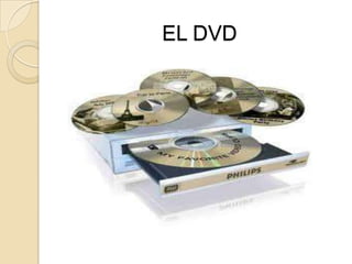 El documento describe las características de los DVDs, incluyendo su capacidad de almacenamiento de hasta dos capas, la capacidad de almacenar hasta 2 horas de video de alta calidad con múltiples pistas de audio y subtítulos, y su uso de compresión MPEG-2. También explica que los DVDs fueron desarrollados originalmente para reemplazar a las cintas VHS y CDs debido a su mayor capacidad y calidad de video y sonido a un menor costo.