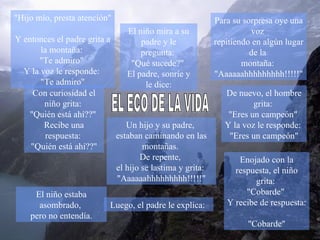 Un niño se lastima en la montaña y grita, escuchando su eco repetir el grito. Al preguntar quién está ahí, también recibe su propia pregunta como respuesta. Su padre le explica que el eco de la vida le devuelve a uno lo que da, ya sea amor, felicidad o una sonrisa. La vida es simplemente un reflejo de nuestras propias acciones.