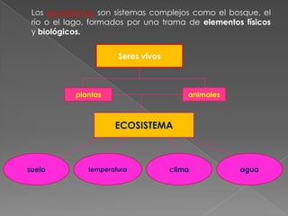 Los ecosistemas son sistemas complejos formados por elementos biológicos y físicos como plantas, animales, suelo, agua y clima. Existen dos tipos principales de ecosistemas: acuáticos como playas, ríos y marismas, y terrestres como sabanas, bosques, selvas y desiertos. Dentro de los ecosistemas, las especies interactúan a través de cadenas alimentarias y relaciones como el mutualismo.