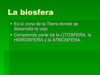Un ecosistema está formado por el biotopo (el medio físico y las condiciones ambientales) y la biocenosis (los organismos vivos). Los ecosistemas pueden clasificarse según su tamaño en microecosistemas, mesoecosistemas y macroecosistemas o biomas, que comprenden grandes extensiones de terreno con características climáticas propias. Dentro de un ecosistema, los seres vivos interactúan entre sí de diferentes formas, como la cadena trófica y relaciones como la depredación, el