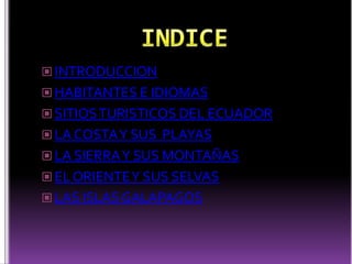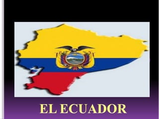Ecuador es un país situado en la parte noroeste de América del Sur que limita con Colombia, Perú y el Océano Pacífico. Tiene cuatro regiones principales - la costa, la sierra, el oriente y las Islas Galápagos - cada una con sus propias características geográficas y lugares turísticos notables. Ecuador alberga una gran diversidad de especies y es considerado uno de los países con mayor biodiversidad del mundo.