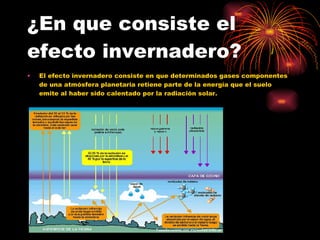 El documento describe el efecto invernadero, los gases que lo producen como el dióxido de carbono, metano y óxido nitroso, y sus fuentes de emisión. También menciona algunas soluciones para reducir los gases de efecto invernadero como usar la bicicleta para trayectos cortos, plantar árboles y reciclar vidrio, plástico y papel.