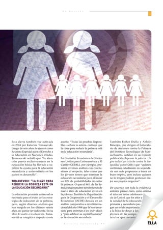 Las investigaciones sobre reducción de la pobreza indican que, además de la educación primaria universal, el acceso a la educación secundaria es crucial, especialmente para las mujeres adolescentes, ya que está relacionado con la disminución de la violencia juvenil, los matrimonios precoces y la mortalidad infantil. Este fenómeno, denominado 'girl effect', subraya la importancia de garantizar la educación de calidad para empoderar a las mujeres y mejorar el bienestar comunitario. A pesar de los avances, aún millones de niños están desescolarizados, lo que resalta la necesidad de fortalecer las acciones educativas.