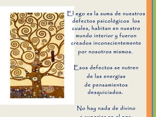 El documento describe la naturaleza del ego como una colección de defectos psicológicos creados por nosotros mismos que causan sufrimiento. Históricamente, el ego se ha representado como demonios, enemigos y monstruos en varias mitologías y religiones. El ego depende de nuestras creencias y alimenta pensamientos de culpa, miedo y separación, pero podemos superarlo practicando el perdón, la tolerancia y el amor.